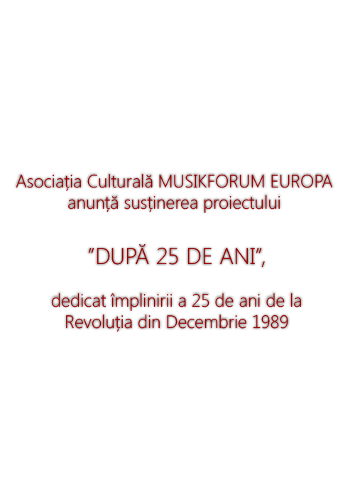 Asociația Culturală MUSIKFORUM EUROPA anunță susținerea proiectului ”DUPĂ 25 DE ANI”, dedicat împlinirii a 25 de ani de la Revoluția din Decembrie 1989 |